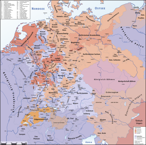 Nach der ersten Phase der Reformation, die Deutschland konfessionell gespalten hatte, versuchten die katholischen und protestantischen Landesherren zunächst eine für beide Seiten akzeptable Verfassungsordnung und ein Mächtegleichgewicht zwischen den Konfessionen im Reich zu finden. Im Augsburger Religionsfrieden vom 25. September 1555 einigten sie sich schließlich auf das Jus reformandi, das Reformationsrecht (später zusammengefasst als cuius regio, eius religio, lateinisch für: wessen Gebiet, dessen Religion; „Herrschaft bestimmt das Bekenntnis“). Demzufolge hatten die Landesherren das Recht, die Konfession der ansässigen Bevölkerung zu bestimmen. Gleichzeitig wurde auch das Jus emigrandi, das Auswanderungsrecht eingeführt, das es Personen einer anderen Konfession ermöglichte, auszuwandern. Unklar blieb aber das Reformationsrecht der freien Reichsstädte, denn der Augsburger Religionsfrieden legte nicht fest, wie sie das Bekenntnis wechseln sollten. Seither waren das katholische und das lutherische Glaubensbekenntnis als gleichberechtigt anerkannt, nicht jedoch das reformierte.[10]