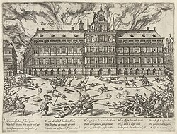 Als 1621 der zwölfjährige Waffenstillstand zwischen den Niederlanden und Spanien auslief, begann auch der niederländische Unabhängigkeitskrieg wieder. Spanien hatte die Friedenszeit genutzt, um seine militärische Kraft zu stärken, sodass es mit einer 60.000 Mann starken Armee die Niederlande bedrohen konnte. Im Juni 1625 gelang es nach fast einjähriger Belagerung, die niederländische Stadt Breda zur Kapitulation zu zwingen, doch eine erneute Finanzknappheit der spanischen Krone behinderte weitere Operationen der flandrischen Armee und verhinderte so die vollständige Eroberung der niederländischen Republik.[46]