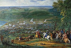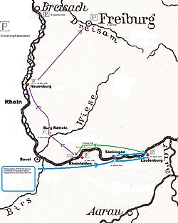 Die direkte Kriegsbeteiligung war für die Franzosen selbst bisher wenig erfolgreich verlaufen, die 1636 im Année de Corbie gerade so eine Katastrophe abwenden konnten[72] und ihre einst vom Trierer Kurfürsten überlassenen Brückenköpfe am Rhein (Philippsburg und Ehrenbreitstein) bis 1637 an die Kaiserlichen verloren hatten.[73] Erst die Entlastung im Kampf gegen die Spanier durch niederländische Erfolge wie die Eroberung von Breda 1637 und die Vorstöße Bernhards von Sachsen-Weimar am Oberrhein brachten Frankreich wieder erfolgreich in das Kriegsgeschehen zurück.[74] Bernhards Heer besiegte 1637 zunächst den Herzog von Lothringen im Norden der Franche-Comté und zog anschließend zum Oberrhein. Ende 1637 noch von Johann von Werth wieder über den Rhein zurückgedrängt, fügte sein Heer den kaiserlichen Truppen im nächsten Jahr mehrere Niederlagen zu. Im Januar 1638 eröffnete das weimarische Heer einen Winterfeldzug auf linksrheinischem Gebiet und nahm die Waldstädte Säckingen und Laufenburg ein. Dann belagerte das Heer die strategisch wichtige Stadt Rheinfelden und besiegte nach einem ersten Misserfolg am 28. Februar im zweiten Versuch am 3. März das von seiner Rückkehr völlig überraschte kaiserliche Entsatzheer unter Savelli und Werth in der Schlacht bei Rheinfelden. Nach der Übernahme der Stadt Freiburg im April 1638 begann das weimarische Heer im Mai 1638 mit der Belagerung von Breisach. Die stark verteidigte Reichsfestung Breisach musste trotz zweier Versuche zum Entsatz durch kaiserlich-bayerische Heere im Dezember 1638 kapitulieren. Ein für 1639 geplanter Feldzug fand nicht statt, da Bernhard von Sachsen-Weimar am 18. Juli 1639 überraschend verstarb.[75]
