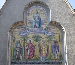 | The mosaic over the main portal of the Dreiheiligenkirche (Three Saints Church) in Innsbruck . The church is dedicated to Saint Rochus , Saint Sebastian and Saint Pirmin - and, since 1786 also to Saint Alexius . Those four saints are shown on the mosaic (from left to right). Above them is Mary with the young Jesus in her arms. The church was finished in 1613 after a plague hit Innsbruck. | Eigenes Werk | Florian Prischl | Datei:Dreiheiligenkirche Innsbruck front mosaic.jpg | |