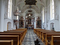 Im Inneren ist die Kirche ein einheitlicher, heller Saalraum, der mit einem flachen Tonnengewölbe mit Stichkappen gedeckt ist. Den Wandpfeilern sind Pilaster vorgelegt. Die Rocaillestuckaturen und die Deckenfresken wurden 1750 von Johann Michael Strickner geschaffen. Aus derselben Zeit stammen die drei Rokokoaltäre aus Stuckmarmor mit Figuren und Putten von Stefan Föger und die Kanzel von Johann Bartlmä Gratl. Das Hochaltarbild zeigt die drei Kirchenpatrone, das linke Seitenaltarbild eine Maria Immaculata von Johann Georg Dominikus Grasmair (1747), das rechte Seitenaltarbild die Taufe Jesu von Melchior Stelzle (1614).