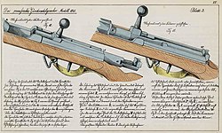 - Der Verschluss wurde von 25,3 cm auf 15 cm gekürzt. Die Luftkammer wurde halbiert und nun Kompressionskammer genannt. Die Verschlussflächen waren anders geformt, was aber keinen Vorteil brachte, da so trotzdem austretende Pulvergase nicht mehr vom Gesicht des Schützen abgelenkt wurden. Auch wurde die Visierung geändert. Die Waffe wurde beim Garde-Schützen-Bataillon und Garde-Jäger-Bataillon in kleiner Stückzahl eingeführt, um verschiedene Änderungen einem Truppenversuch zu unterziehen. [54]