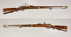 - Ab diesem Modell wurde der Lauf aus Gussstahl hergestellt. Der Verschluss wurde auf 17 cm verkürzt. Der Entladestock konnte ausgefahren und arretiert werden und diente als dreikantiges Pikenbajonett. Zum ersten Mal bei einem preußischen Gewehr wurde die Visierung mit Entfernungszahlen beschriftet. Eingeführt bei Jägerbataillonen und der Preußischen Marine. [55]