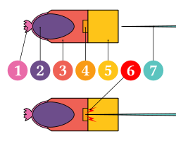 1. Hülle, 2. Geschoss, 3. Treibspiegel, 4. Anzündmittel, 5. Treibladung, 6. Zündfunken für Treibladung, 7. Zündnadel