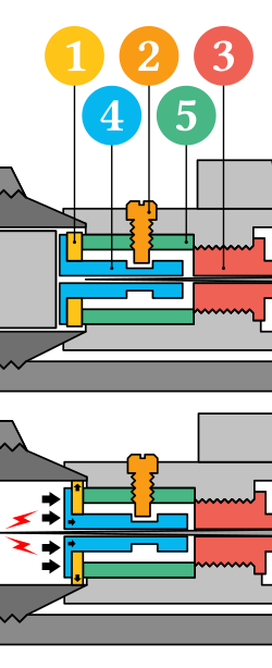 - Im Gegensatz zu dem außen angebrachten Stein- bzw. Perkussionsschloss befindet sich das Schlösschen innerhalb der Waffe (Innenzündung). Die Zündung erfolgt mit einer Zündnadel (7), die beim Abzug durch eine gespannte Schraubenfeder in die Patrone hineingetrieben wird. Die lange Zündnadel muss erst die Papierhülle und das Treibmittel durchstoßen, um zu der Zündpille zu gelangen (6).[28]