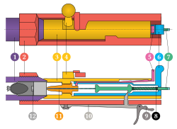 Die Abzugsfeder (10) dient zum Halten und Abdrücken des Schlosses. Der Abzugszüngel (9) bewegt die Abzugsfeder. Dieser geht in das Druckstück mit den drei Drucknasen über. Durch Spannen des Abzugszüngels wird der Schuss ausgelöst. Beim vollständigen Durchdrücken des Abzugszüngels wird die Kammer entriegelt und aus der Kammerhülse herausgezogen.[33]