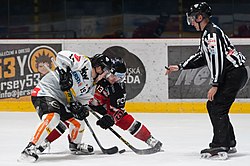 | EBEL Orli Znojmo gegen Dornbirner EC am 6. März 2016 in Znojmo: Dustin Sylvester, Colton Yellow Horn | Eigenes Werk | Ailura | Datei:20160306 ZNO vs DEC 8772.jpg | |