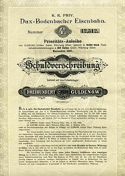 | eine Nonvaleur-Anleihe der Dux-Bodenbacher Eisenbahn-Gesellschaft aus dem Jahr 1891 | Eigener Scan | Dux-Bodenbacher Eisenbahn-Gesellschaft; scanned by de:User:Priwo | Datei:Anleihe01.jpg | |