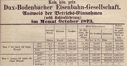 | Bekanntmachung der Betriebseinnahmen der de:Dux-Bodenbacher Eisenbahn-Gesellschaft in der Leipziger Zeitung vom 8. November 1873 | Leipziger Zeitung vom 8. November 1873 | Autor/-in unbekannt Unknown author | Datei:Betriebseinnahmen der DBE 1873.jpg | |