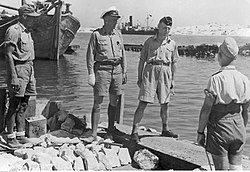 | Wiceadmirał Eberhard Weichold (drugi z prawej) odbiera raport od oficera w porcie Marsa Matruh. W tle widoczne statki. | https://audiovis.nac.gov.pl/obraz/1347/ | Pietzsch | Datei:Wiceadmirał Eberhard Weichold w porcie Marsa Matruh (2-2036).jpg |