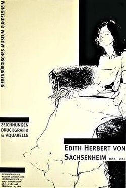 | Poster of the 1998 Transylvanian Museum exhibition featuring a drawing of Eleanor Garrett-Ward (1908) | Transylvanian Museum | Author of the drawing - Edith Soterius von Sachsenheim (1908) Author of the poster - Transylvanian Museum | Datei:Edith Soterius von Sachsenheim (1998 poster).jpg | |