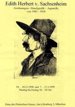 | Poster of the 1999 Haus des Deutschen Ostens exhibition featuring the drawing Italian Man With A Hat (1912) | Transylvanian Museum | Author of the drawing - Edith Soterius von Sachsenheim (1908) Author of the poster - Transylvanian Museum | Datei:Edith Soterius von Sachsenheim (1999 poster).jpg | |
