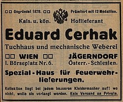 | Annonce des k.k. Hoflieferanten Eduard Cerhak.in: Fromme's Österreichischer Feuerwehr-Kalender, 1913 | Österreichische Nationalbibliothek, Zeitschriftenarchiv | keine Schöpfungshöhe | Datei:Eduard Cerhak Annonce 1913.jpg |