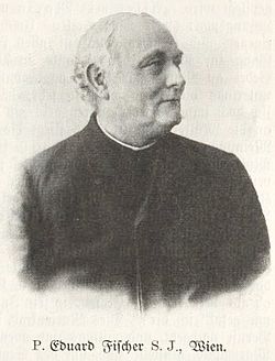 Eduard Fischer wurde 1846 als Sohn des bürgerlichen Webers Anton Fischer und dessen Ehefrau Theresia geb. Loos in Jechnitz geboren. Im Jahre 1864 trat er in den Jesuitenorden ein. Er war zunächst als Erzieher in Linz-Freinberg, Mariaschein und Kalksburg tätig, anschließend wirkte er als Volksmissionar. Daneben war Pater Eduard Fischer für die Organisation der Seelsorge an der neu erbauten Canisiuskirche in Wien zuständig. Von 1899 bis 1920 war er Herausgeber des Canisiuskalenders.