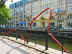 | Installation 'Anmerkung' aus Baustahlträgern von Eduard Habicher aus dem Jahr 2010 auf der Fischerinsel am Spreekanal in Berlin-Mitte, gegenüber U-Bahnhof Spittelmarkt. Teil Habichers Wassergalerie 'Der Rote Faden am Hafen' entlang des Spreekanals. | Eigenes Werk | Lotse | Datei:Anmerkung (Eduard Habicher) - 1014-896-(118).jpg | |
