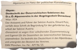 - ↑ Andreas Jentzsch: „Gegen Intoleranz und Hass 1921 – 1945 uns Bergsteigern zur Mahnung“. Die „Austria“ bedenkt ihre Vergangenheit. In: oeav-events.at, OeAV Sektion Austria, Austria Nachrichten, Heft 5/02. PDF online ( vom 5. Mai 2014 im Internet Archive)