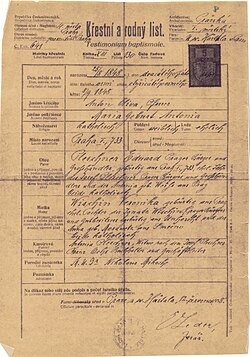 | 1938 gefertigte Abschrift der Geburtsurkunde einer Tochter von 1848, in der Eduard Pleschner (1813-1864) und seine Frau Veronika Wischin als Eltern genannt sind. Wrong Lemma: it is a Geburtsurkunde | 1 | Autor/-in unbekannt Unknown author | Datei:Heiratsurkunde Pleschner - Vischin.jpg | |
