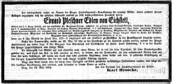 | Todesanzeige für Eduard Pleschner von Eichstett (1813-1864) | Prager Tageszeitung "Bohemia", Morgenblatt vom 24. Mai 1864, S. 1477 | Autor/-in unbekannt Unknown author | Datei:Todesanzeige Eduard Pleschner.jpg | |
