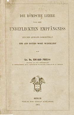 Am 8. Dezember 1854 verkündete Papst Pius IX. das Dogma von der Unbefleckten Empfängnis Mariens (Befreiung Mariens von der Erbsünde), wogegen sich im protestantischen Bereich eine starke Gegenbewegung formierte, die diesen Glaubenssatz nachhaltig bestritt. Zu ihr gehörte auch Eduard Preuß. Er verfasste dagegen eine theologische Schrift mit dem Titel Die Römische Lehre von der unbefleckten Empfängniss: aus den Quellen dargestellt und aus Gottes Wort widerlegt, welche auch in Fremdsprachen übersetzt wurde.[6] Hierdurch erlangte Preuß eine große Bekanntheit als protestantischer Theologe. In der teils polemischen Schrift griff Preuß nicht nur die katholische Kirche, sondern auch den Rationalismus im protestantischen Lager an, was zu heftigen Kontroversen und Auseinandersetzungen führte, da die Universität Berlin vom liberalen Protestantismus dominiert war.