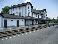 - Das Aufnahmsgebäude des Bahnhofs und der ehemalige Wasserturm, beide um 1870 errichtet