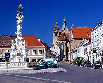 | Hauptplatz von Eggenburg mit mit gotischen Giebelhäusern und Sgraffitohaus, Pranger, Martinsbrunnen, Mariensäule, in Mitten des Hauptplatzes befindet sich das Grätzel | Eigenes Werk | zyance | Datei:Eggenburg z001.JPG |