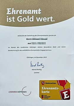 | Bild eines Briefes vom Landrat des Landkreises Göttingen zur Verleihung der Ehrenamtskarte mit Ehrenamtskarte | Eigenes Werk | Michael32710 | Datei:2023-12-20 EhrenamtskarteNI HB.jpg | |
