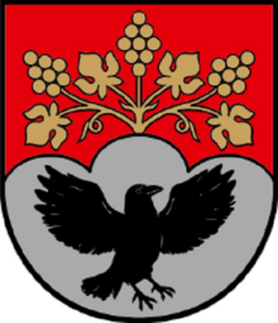 Mit Wirkung vom 15. Oktober 2024 wurde das Recht zur Führung eines Gemeindewappens mit folgender Beschreibung verliehen: „Von Rot und Silber im Dreibergschnitt geteilt, oben aus dem mittleren Berg in Form eines Lebensbaumes wachsend eine goldene Weinrebe von drei Trauben und vier Blättern, unten ein nach links auffliegender schwarzer Rabe.“