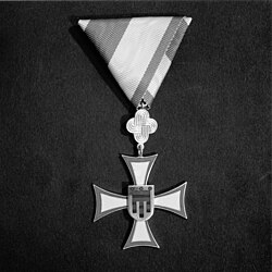 | Ehrenzeichen des Landes Vorarlberg . Beim goldenen Ehrenzeichen sind sowohl das Kreuz als auch das Flechtbandornament echt vergoldet, beim silbernen Ehrenzeichen echt versilbert. | https://pid.volare.vorarlberg.at/o:81182 | Vorarlberger Landesbibliothek, Sammlung Helmut Klapper | Datei:Ehrenzeichen des Landes Vorarlberg.jpg |