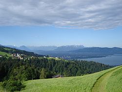| Blick über die Pfarrkirche St. Bernhard am Eichenberg ( Vorarlberg ), auf den Bodensee und die Schweizer Berge des Alpstein . Rechts im Bild: Lindau am Bodensee. Veröffentlicht: Georg Kessler in Freizeit im Ländle, Die schönsten Ausflugziele in Vorarlberg , ISBN 978-3-7022-3068-5 2010 | Eigenes Werk | böhringer friedrich | Datei:Eichenberg 01.JPG | |