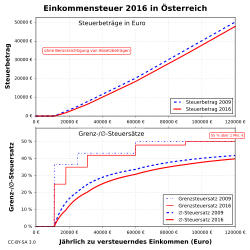 | Grafische Darstellung des Einkommensteuertarifs in Österreich ab 2016 im Vergleich zu 2009 (ohne Berücksichtigung von Absetzbeträgen) | Eigenes Werk | Udo Brechtel | Datei:Einkommensteuer A 2016 vs 2009.svg | |