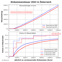 | Grafische Darstellung des Einkommensteuertarifs in Österreich 2022 im Vergleich zu 2009 (ohne Berücksichtigung von Absetzbeträgen) | Eigenes Werk | Udo.Brechtel | Datei:Einkommensteuer A 2022 vs 2009.svg | |