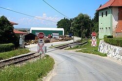 Schrankenanlage mit rotierendem Warnsignal („Löffelrad“) in Feistritz im Rosental 2021