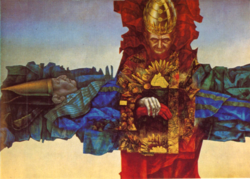 | "Die Päpste" shows pope Paul VI holding the hand of dead pope John XXIII by painter Elsa Olivia Urbach. | Elsa Olivia Urbach: Magische Figuration. 25 Jahre Schaffen (Wien 1975), 59. | Elsa Olivia Urbach | Datei:Die Päpste.png | |