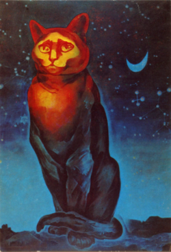 | Felis Coelestis shows a orange illuminated cat under a star sparkled sky by painter Elsa Olivia Urbach. | Elsa Olivia Urbach: Magische Figuration. 25 Jahre Schaffen (Wien 1975), 66. | Elsa Olivia Urbach | Datei:Felis Coelestis.png | |