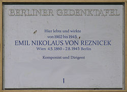 | Berliner Gedenktafel , Emil Nikolaus von Reznicek , Knesebeckstraße 32, Berlin-Charlottenburg , Deutschland | Selbst fotografiert | OTFW , Berlin | Datei:Gedenktafel Knesebeckstr 32 (Charl) Emil Nikolaus von Reznicek.jpg |