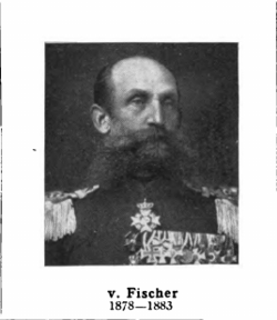 Wilhelm I. erhob ihn am 24. Juni 1882 in den erblichen preußischen Adelsstand.[1] Unter Stellung à la suite seines Regiments beauftragte man Fischer am 6. Dezember 1883 mit der Führung der 33. Infanterie-Brigade. Mit der Beförderung zum Generalmajor wurde er am 12. Januar 1884 zum Kommandeur des Großverbandes in Schwerin ernannt. In gleicher Funktion kommandierte Fischer vom 22. März 1886 bis zum 9. Juli 1888 die ebenfalls in Schwerin stationierte 34. Infanterie-Brigade. Anschließend beauftragte man ihn mit der Führung der 14. Division in Düsseldorf. Zeitgleich mit seiner Beförderung zum Generalleutnant wurde Fischer am 4. August 1888 Divisionskommandeur. Am 24. März 1890 folgte seine Ernennung zum Gouverneur der Festung Metz. In dieser Funktion erhielt Fischer am 2. September 1892 den Charakter als General der Infanterie und wurde zudem für seine langjährigen Verdienste mit dem Kronenorden I. Klasse sowie dem Roten Adlerorden I. Klasse mit Eichenlaub ausgezeichnet. Am 13. März 1894 wurde Fischer in Genehmigung seines Abschiedsgesuches mit der gesetzlichen Pension zur z. D. gestellt.