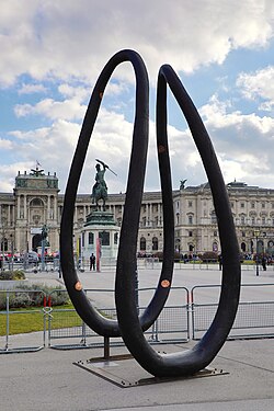 | Das „Corona-Denkmal der Hoffnung“ am Heldenplatz im 1. Wiener Gemeindebezirk Innere Stadt. Das von der Essl Foundation (Martin & Gerda Essl) gestiftete Denkmal wurde von den Künstlern Emmerich Weissenberger & Nora Ruzsics geschaffen. Ursprünglich war die etwa 5 Meter hohe Lemniskaten-Skulptur aus Kiefernholz (geflammt, geölt und gewachst) ab dem 4. August 2020 in der Stadt Salzburg aufgestellt: 1 . Später wurde sie für ein Jahr auf den Heldenplatz übertragen und am 12. November 2021 im Beisein des Präsidenten des Nationalrats Wolfgang Sobotka feierlich enthüllt: 2 . Offizielle Denkmal-Website: https://www.coronadenkmal.at/ | Eigenes Werk | C.Stadler/Bwag | Datei:Wien - Corona-Denkmal der Hoffnung.JPG |