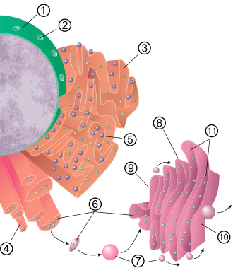 | Beschreibung Secretory pathway diagram, including nucleus, endoplasmic reticulum and golgi apparatus. Nuclear membrane Nuclear pore Rough endoplasmic reticulum (rER) Smooth endoplasmic reticulum (sER) Ribosome attached to rER Macromolecules Transport vesicles Golgi apparatus Cis face of Golgi apparatus Trans face of Golgi apparatus Cisternae of Golgi apparatus | Eigenes Werk, basierend auf: Nucleus ER golgi.jpg | Nucleus ER golgi.jpg : Magnus Manske / abgeleitetes Werk: Pbroks13 | Datei:Nucleus ER golgi.svg | |