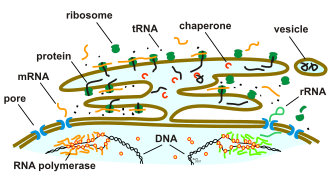 | Nuclear surface rough endoplasmatic reticulum and suborganelles | Eigenes Werk | Adjustit | Datei:ProteinTranscription+Synthesis.svg |
