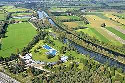 | Das Erholungszentrum Rheinauen ist eines der größten Freibäder Westösterreichs im Gemeindegebiet der Vorarlberger Stadt Hohenems direkt an der Grenze zur Schweiz gelegen. Luftaufnahme aus östlicher Richtung. | Eigenes Werk | Plani | Datei:Rheinauen Hohenems.jpg |