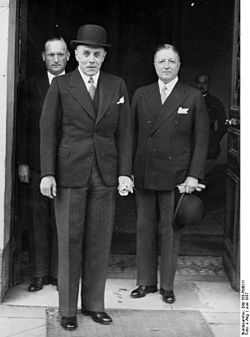 | Es folgt die historische Originalbeschreibung , die das Bundesarchiv aus dokumentarischen Gründen übernommen hat. Diese kann allerdings fehlerhaft, tendenziös, überholt oder politisch extrem sein. Hans Speidel, Ludwig Beck, Erich v. Kühlenthal ZentralbildDer Chef des deutschen Generalstabes General Ludwig Beck besucht im Juni 1937 die Pariser Weltausstellung und wird auch eine Unterredung mit dem französischen Generalstabschef General Gamilin haben.UBz: Oberst Speidel (links), General Beck (Mitte) und Generalleutnant Kühlenthal, der Militär-Attaché an der deutschen Botschaft in Paris beim Verlassen des französischen Kriegsministeriums nach der Unterredung mit General Gemelin.7860-37 Frankreich, Paris.- vlnr: Oberst Hans Speidel, General Ludwig Beck, Generalleutnant Erich von Kühlenthal Abgebildete Personen: Beck, Ludwig: Generaloberst, Heer, 20.7.1944 hingerichtet, Deutschland Speidel, Hans Dr. : General, Oberkommandierender NATO-Streitkräfte Mitteleuropa, Bundesrepublik Deutschland ( GND 118616013 ) Kühlenthal, Erich von: General, Militärattaché in Frankreich, Deutschland | Dieses Bild wurde im Rahmen einer Kooperation zwischen dem deutschen Bundesarchiv und Wikimedia Deutschland aus dem deutschen Bundesarchiv für Wikimedia Commons zur Verfügung gestellt. Das deutsche Bundesarchiv gewährleistet eine authentische Bildüberlieferung nur durch die Originale (Negative und/oder Positive), bzw. die Digitalisate der Originale im Rahmen des Digitalen Bildarchivs . | Unbekannt Unknown | Datei:Bundesarchiv Bild 183-R99011, Hans Speidel, Ludwig Beck, Erich v. Kühlenthal.jpg | |