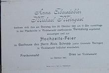 | Hochzeit Einladung für die Eltern von Erika Meingast | unbekannt | unbekannt | Datei:Hochzeit Einladung für die Eltern von Erika.jpeg |