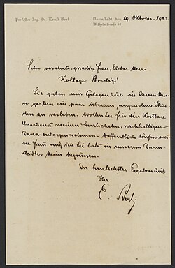 | Thank you note from Ernst Berl (1877-1946) to Georg Bredig (1868-1944) and his wife Rosa Bredig (1877-1933). Note thanks them for their hospitality and invites the Bredigs to stay at his home in Darmstadt, Germany in the future. Ernst Berl, was an Austrian chemist and professor of technical and macromolecular chemistry. During World War One, he produced explosives and chemical weapons. In 1919, he accepted a position at the Technical University of Darmstadt as a professor. | This file was contributed to Wikimedia Commons by Chemical Heritage Foundation as part of a cooperation project. The donation was facilitated by the Digital Public Library of America , via its partner PA Digital . Record in source catalog DPLA identifier: fde260a0b156460cfde876728d08a165 Chemical Heritage Foundation identifier: padig:SHI-qlo7zs3 | Datei:Thank you note from Ernst Berl to Georg and Rosa Bredig - DPLA - fde260a0b156460cfde876728d08a165.jpg |
