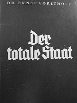 Das bekannteste Werk Forsthoffs aus der Zeit des Nationalsozialismus ist die 1933 erschienene Schrift Der totale Staat. Darin versuchte er, einige Vorbehalte gegenüber dem politischen Selbstverständnis der NS-Bewegung anzubringen, der er gleichwohl revolutionäre Legitimität zuerkannte, und in welcher er den jungkonservativen Kampf gegen die Weimarer Demokratie siegreich vollendet sah. Forsthoff bündelte die konservativ-revolutionären Thesen, wie sie von der Gruppe um Stapel und Schmitt schon vor 1933 entwickelt worden waren. Die Schrift gilt deshalb zugleich als Standortbestimmung der Konservativen Revolution gegenüber dem Nationalsozialismus (Armin Mohler) und als Ausdruck der Schmittschen Verfassungstheorie bis 1933. Sie stieß bei Alfred Rosenberg und Roland Freisler auf Kritik, die darin einen der nationalsozialistischen Weltanschauung widersprechenden Etatismus sahen. Forsthoff arbeitete Der totale Staat für eine zweite Auflage 1934 um und nahm seine Vorbehalte dabei zurück. Er akzeptierte nun die Einheit von Partei und Staat als „überlegene Staatskunst“ und rechtfertigte auch die Morde im Zuge des sogenannten Röhm-Putsches.[12] Laut Herlinde Pauer-Studer verknüpfte Forsthoff in der Schrift Hans F. K. Günthers Rassenideologie mit vulgärstem Antisemitismus.[13] Zur Diskriminierung und Verfolgung der Juden schreibt Forsthoff: „Darum wurde der Jude … zum Feind und mußte als solcher unschädlich gemacht werden“.[14] Der Begriff des „totalen Staates“ wurde später von der politischen Theorie im Begriff „Totalitarismus“ aufgegriffen.[15]