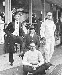 | Die österreichische Equipe beim internationalen Fechtturnier am Lido: Béla Békéssy, Maestro Luigi Della Santa, George M. Tafler, Ernst Königsgarten (v.l.n.r.) | Sport und Salon | Autor/-in unbekannt Unknown author | Datei:Wiener Fechtklub 1909.jpg |