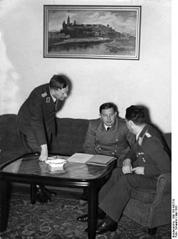 | Es folgt die historische Originalbeschreibung , die das Bundesarchiv aus dokumentarischen Gründen übernommen hat. Diese kann allerdings fehlerhaft, tendenziös, überholt oder politisch extrem sein. Krakau, Besprechung mit Dr. Joseph Bühler Generalgouverneur Dr. Hans Frank und seine Mitarbeiter. Ein Bildbericht vom Sitz der Regierung des Generalgouvernements in Krakau.U.B.z. Besprechnung im Büro des Staatssekretärs Dr. Josef Bühler (Mitte), links: Oberlandesforstmeister Dr. Eisfeld, rechts: Unterstaatssekretär Kundt.Fot. Schwahn 12.5.41 Herausgabedatum Abgebildete Personen: Bühler, Joseph Dr.: Staatssekretär des Generalgouvernements in Krakau, Deutschland Eisfeld, Dr.: Oberlandesforstmeister, Deutschland | Dieses Bild wurde im Rahmen einer Kooperation zwischen dem deutschen Bundesarchiv und Wikimedia Deutschland aus dem deutschen Bundesarchiv für Wikimedia Commons zur Verfügung gestellt. Das deutsche Bundesarchiv gewährleistet eine authentische Bildüberlieferung nur durch die Originale (Negative und/oder Positive), bzw. die Digitalisate der Originale im Rahmen des Digitalen Bildarchivs . | Schwahn | Datei:Bundesarchiv Bild 183-B02732, Krakau, Besprechung mit Dr. Joseph Bühler.jpg | |