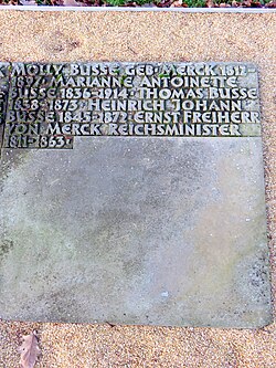 | Doppel-Sammelgrab Familie Merck im Bereich des Althamburgischen Gedächtnisfriedhofs auf dem Hamburger Friedhof Ohlsdorf zu Ehren von unter anderen : Heinrich Johann Merck , seiner zweiten Ehefrau Marianne geborene Rohlffs und seines ältesten Sohnes Heinrich Johann Merck (1804-1835) aus der Ehe mit seiner früh verstorbenen ersten Ehefrau, Justus Ruperti und seiner Ehefrau Marie Pauline geb. Merck, Carl Hermann Merck und seiner Ehefrau Louise Susette, geb. Godeffroy, Ernst Freiherr von Merck sowie seiner Schwester Molly Busse (1812-1897). | Eigenes Werk | Vitavia | Datei:Sammelgrab FamilieMerck AhGf (4).jpg |