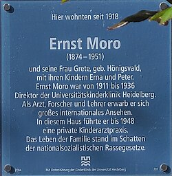 - ↑ Webseite Universitätsklinikum Heidelberg: Gedenktafel Ernst Moro enthüllt ( des vom 28. Februar 2017 im Internet Archive) Info: Der Archivlink wurde automatisch eingesetzt und noch nicht geprüft. Bitte prüfe Original- und Archivlink gemäß Anleitung und entferne dann diesen Hinweis., abgerufen am 27. Februar 2017.