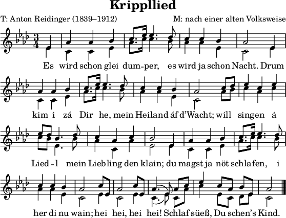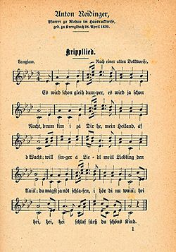 | Noten zum Lied Es wird scho glei dumpa (Es wird schon gleich dunkel) | „Kripplgsangl und Kripplspiel“ von 1884 Christine Grüll: „Du dichtender Dechant“ , Artikel in der Kirchenzeitung Diözese Linz vom 04.12.2012, aufgerufen am 7. 12. 2015 | Anton Reidinger | Datei:Anton Reidinger - Krippllied.jpg | |