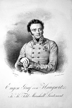 | Eugen Wilhelm Graf Haugwitz (1777-1867), österreichischer 'GeneralLithographie von Josef Kriehuber, 1827 | Eigenes Foto einer Originallithographie der Albertina (Wien) | Josef Kriehuber (1800-1876); Foto Peter Geymayer | Datei:Eugen Wilhelm Haugwitz 1827 Litho.jpg | |